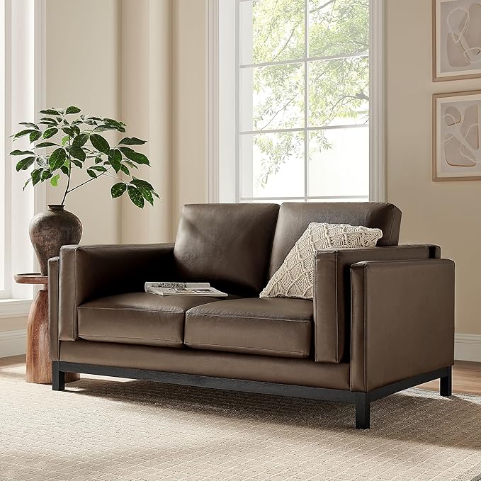 Roscoe 63 Inch Vegan Leather Loveseat in Espresso – Comfortable Faux Leather 2 Seater Couch for Living Room, Apartment, or Office Seating